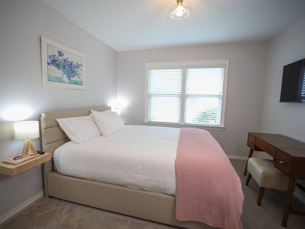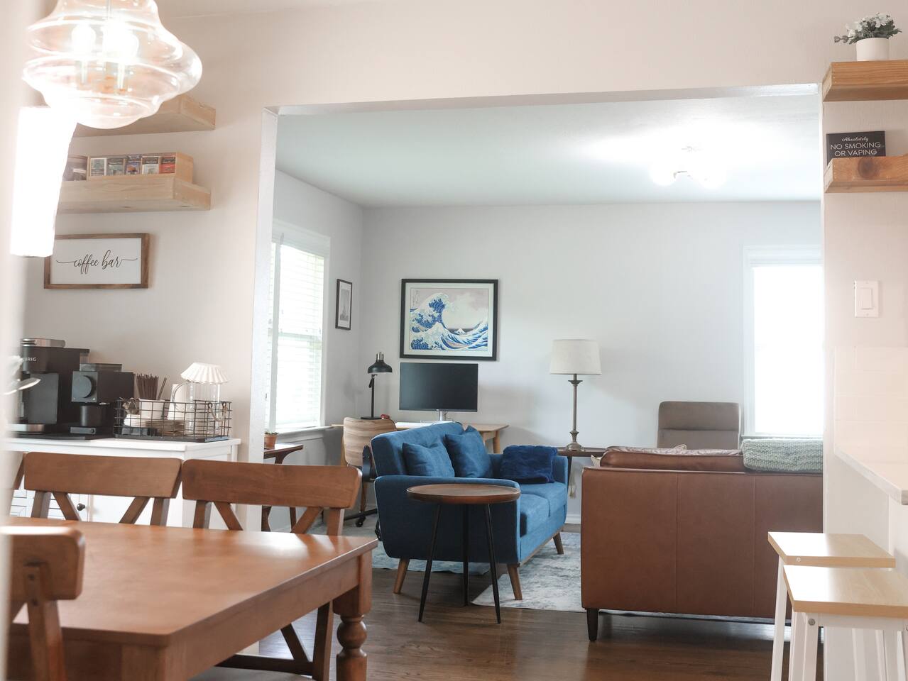 Flamingo Lane House: renovated 3BR/2BA (1,200 sf) near White Rock Lake. Sleeps 8. Bright living room with 75” Smart TV; bedrooms also have Smart TVs with free content + Guest Mode for your apps. Chef-ready kitchen with farmhouse sink and Cultivar coffee. Backyard pergola dining for 6, grill, and 8 Adirondack chairs. Peloton + yoga mat. Work-ready desk with one-wire USB-C monitor, wired keyboard/mouse, and AirPrint printer. Walkable—supermarket 2 blocks; 15 min to Downtown/Deep Ellum/Arboretum.